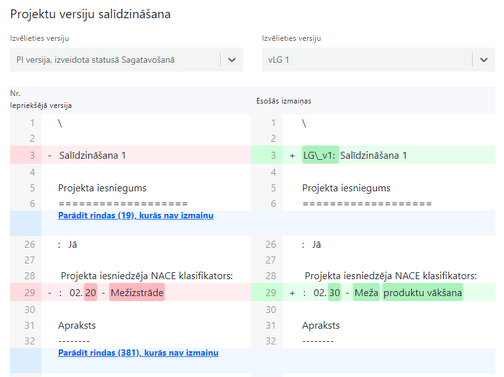 Nospiežot uz salīdzināšanas ikonu "Skatīt izmaiņas" tiek attēlots salīdzinājums starp esošo un iepriekšējo PI grozījumu konstruktora versiju.
