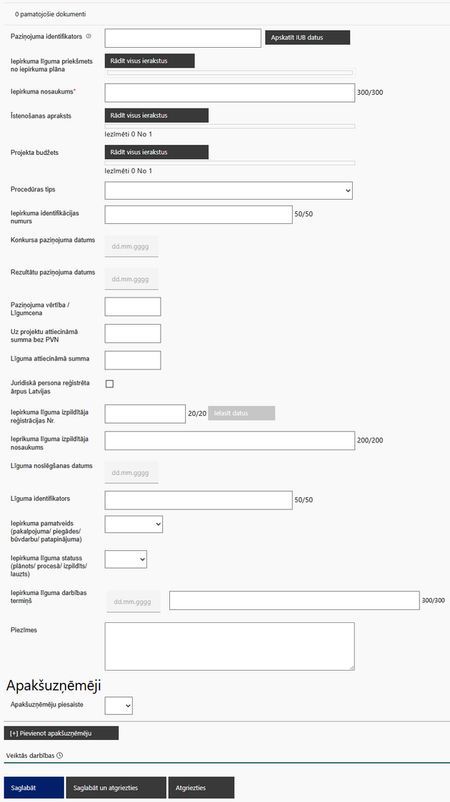 | Līguma grozījuma numurs | Automātiski aizpildīts datu lauks, kas satur līguma grozījuma numuru (ja tāds eksistē).
