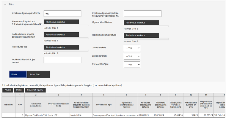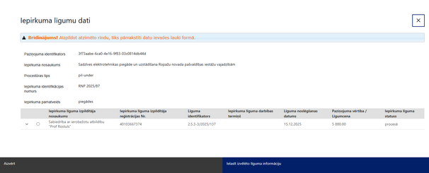 | Brīdinājums | MP visu līgumu “Uz projektu attiecināmā summa ar PVN” summa nepārsniedz PI (MP piesaistītās versijas) “Kopējās attiecināmās izmaksas”. Summā netiek ņemti vērā līgumi statusā lauzts. | Ja MP Līguma (5.1) datu laukā "Iepirkuma līguma statuss" ir norādīts statuss "plānots" vai "procesā", vai "izpildīts", tad šie datu lauki ir obligāti jāaizpilda (neļauj iesniegt MP, ja summas nav norādītas) :