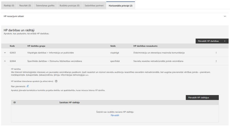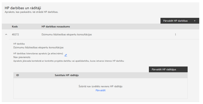 - Rādītāji - tiek attēlots MK noteikumos definēto, īstenošanai izvēlēto un izveidoto rādītāju skaits;